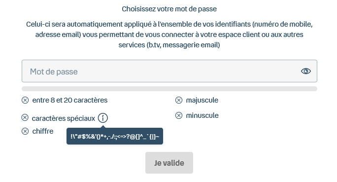Password can't contain special chars other than ASCII ones (for a French website this sucks as é, à, ç and so on are rejected...)