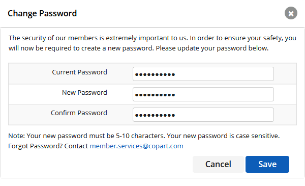Copart: "The security of our members is extremely important to us." Also Copart: "We're gonna need you to keep your password between 5-10 characters."