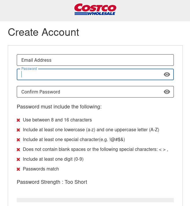 Due to Costco's short max password length of 16 characters, I strongly recommend using a password manager to make a random password to satisfy all of these conditions below: