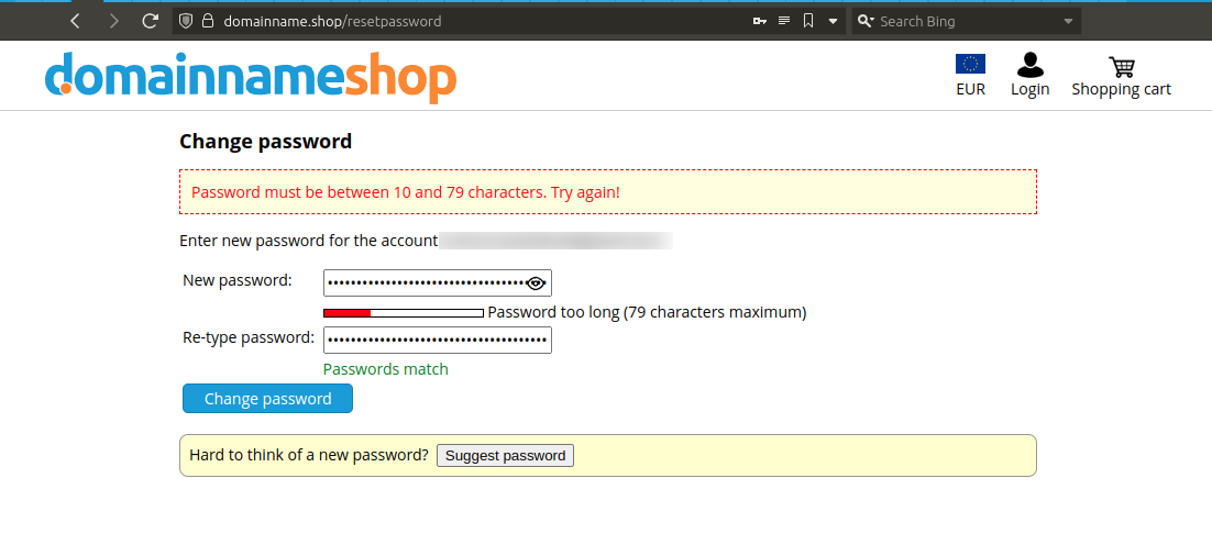 domainname.shop operates under several domains, domene.shop (Norway), domän.shop (Sweeden), domæne.shop (Denmark). The following characters are allowed: A-Z, a-z, 0-9 and + - * / ! ? . , : ; = # @ $ % & ( ) < >, password length 10-79 chars
