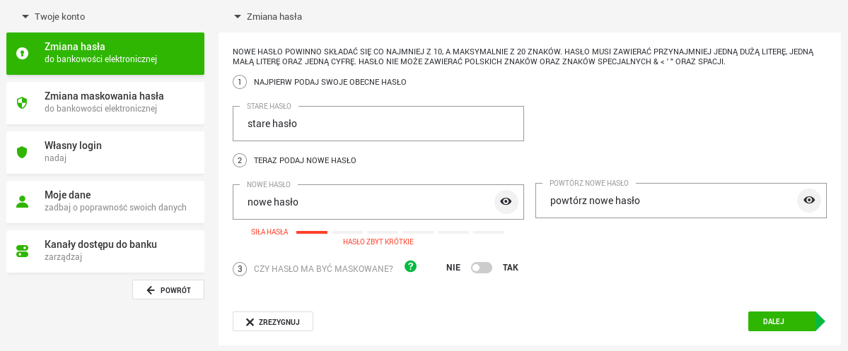 The new password should contain at least 10 and a maximum of 20 characters. The password must contain at least one upper case letter, one lower case letter and one number. The password cannot contain non-ASCII Polish alphabet characters, special characters &<'" or spaces.