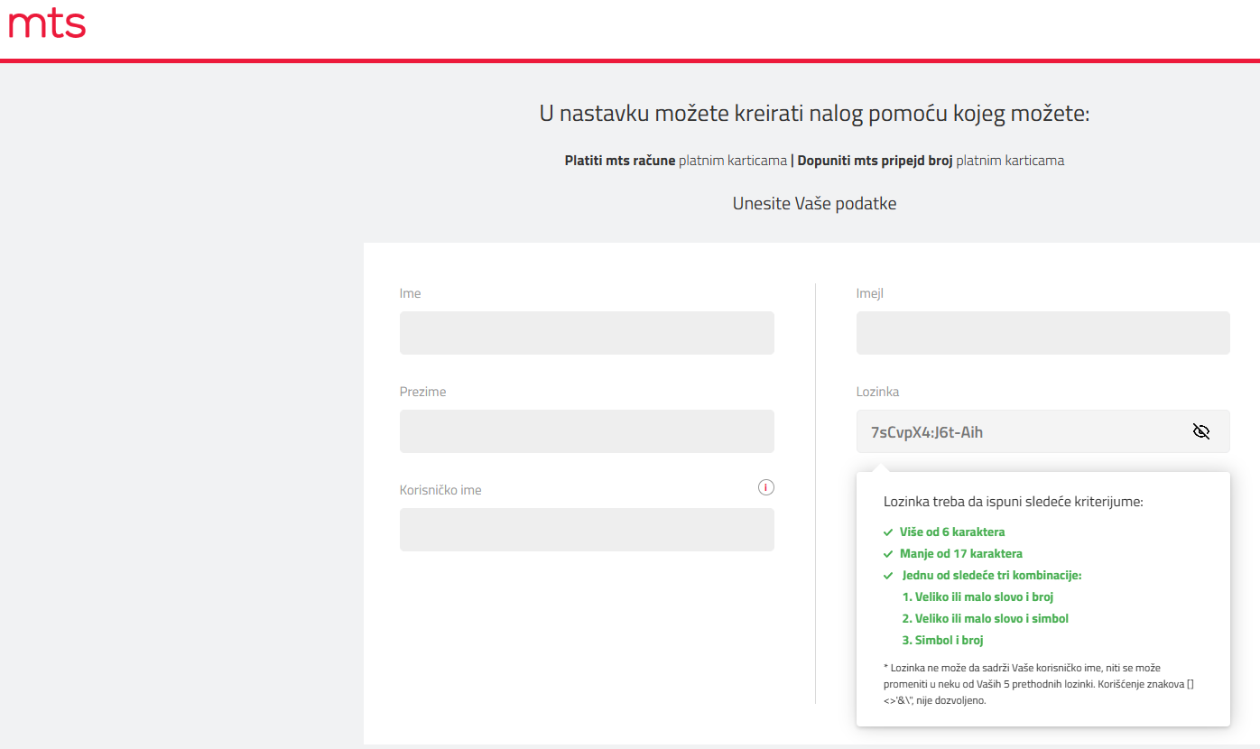 MTS is a national mobile and internet provider in Serbia and they have bad password rules. Translation: The password must have more than 6 character, less than 17 characters and one of the following combinations: upper case or lower case letter and a number, upper case or lower case letter and a symbol, and a symbol and a number. Characters []<>'&", are not allowed.