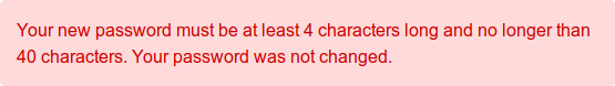 Your new password must be at least 4 characters long and no longer than 40 characters. Your password was not changed.
