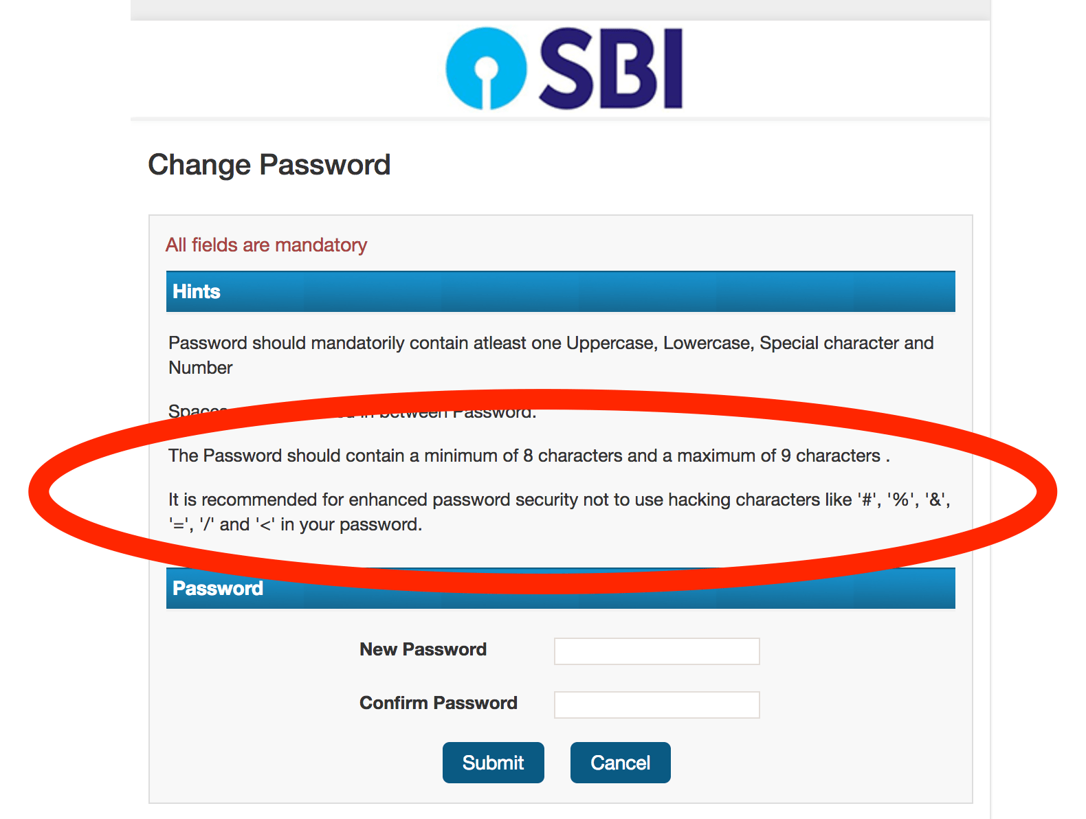 State Bank of India (Foreign Travel Card) dumb password rule screenshot