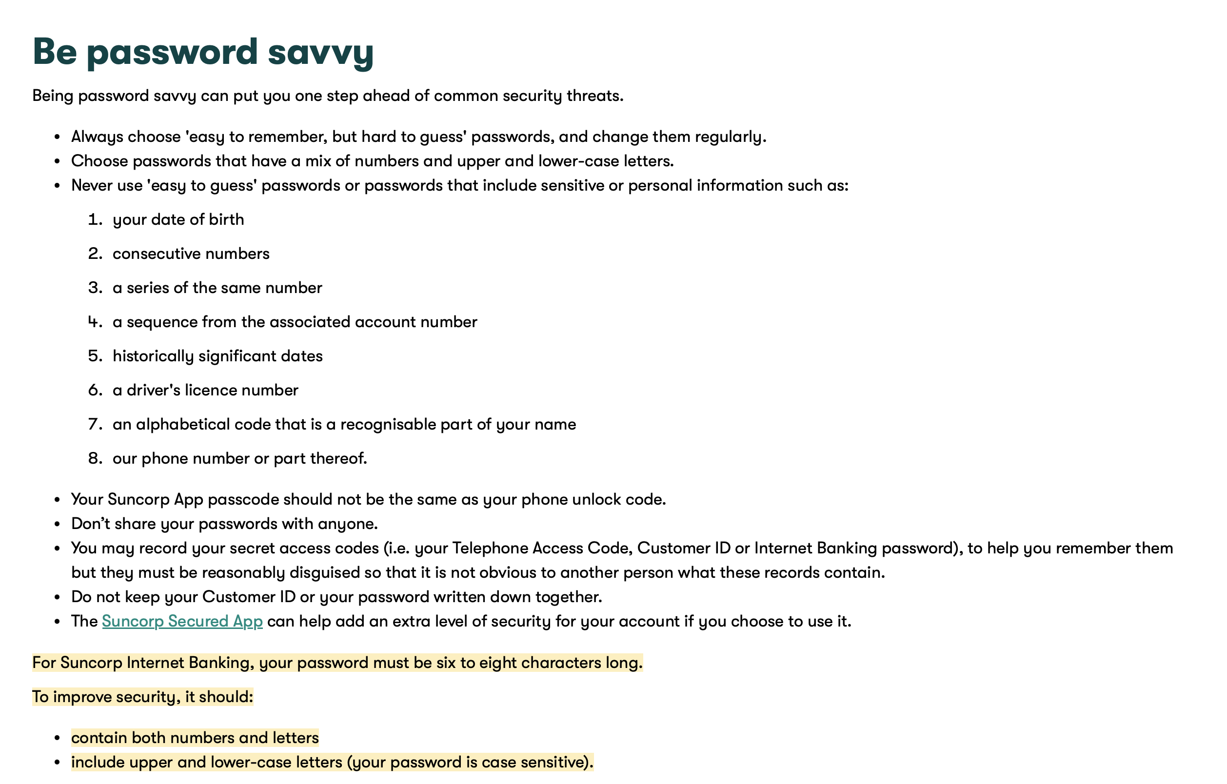 To "improve security" and "be password savvy", passwords must: