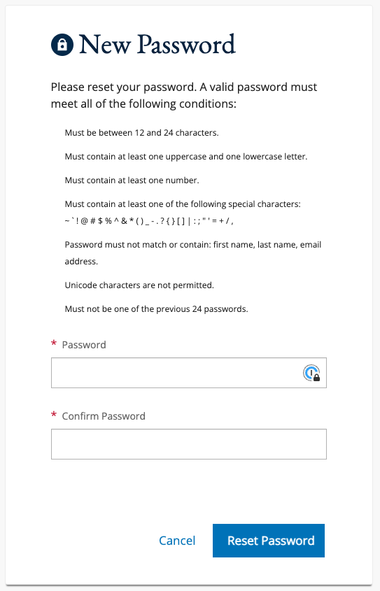 • Password must not match or contain: first name, last name, email address.