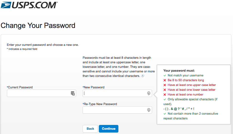 United States Postal Service dumb password rule screenshot
