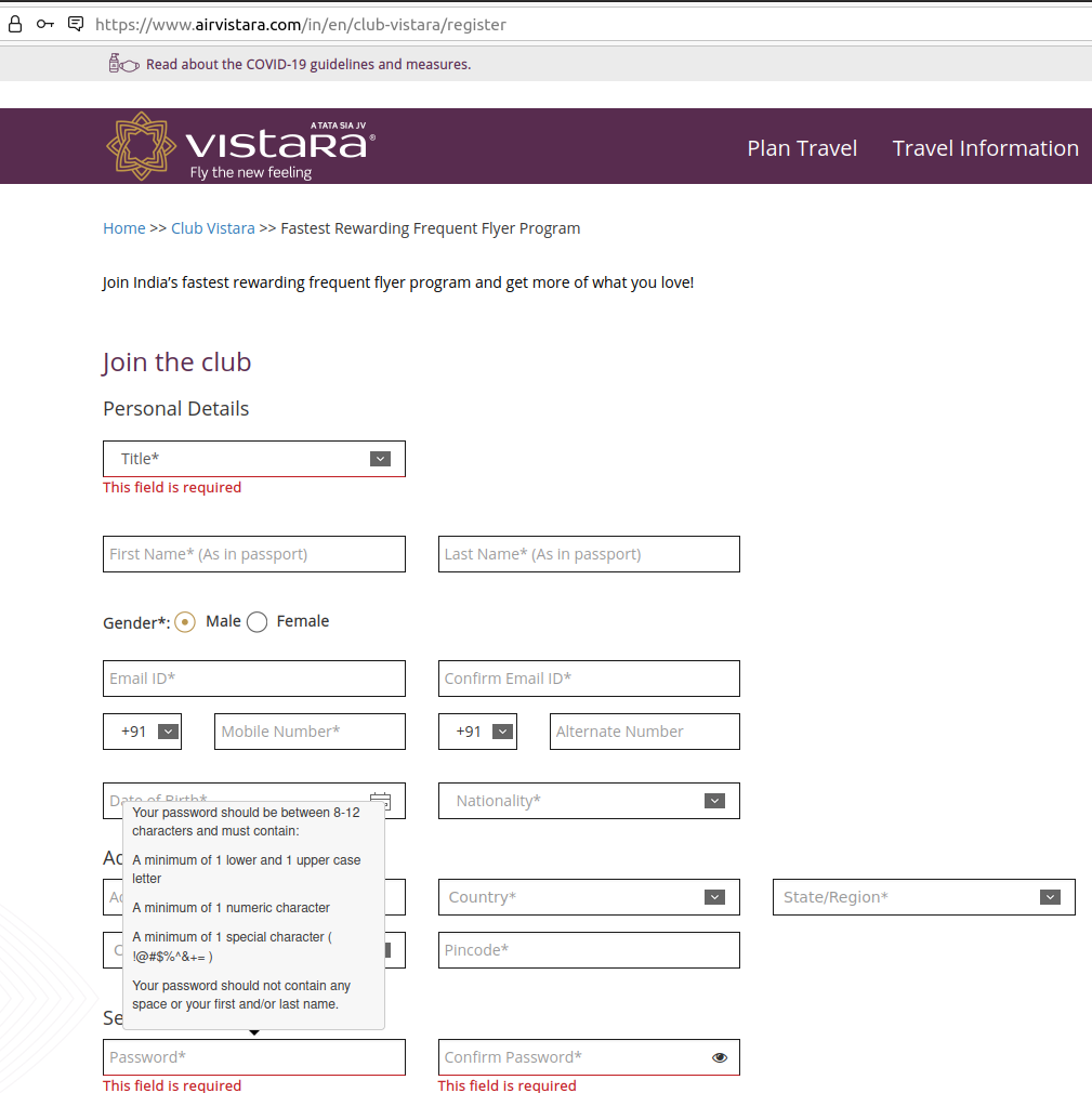 Vistara dumb password rule screenshot